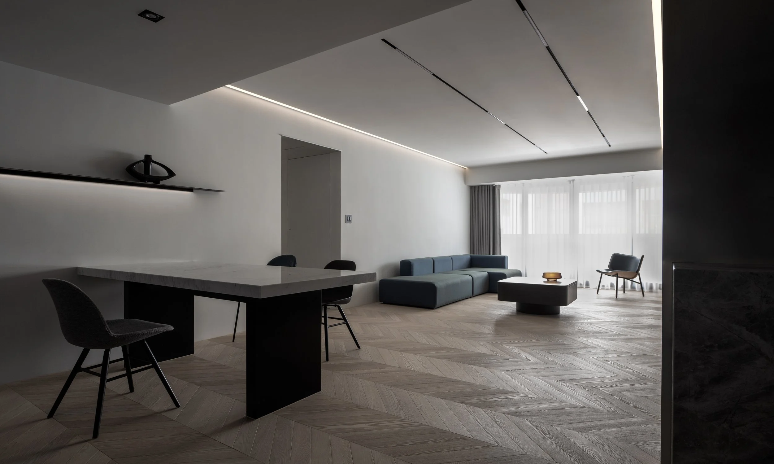 The flooring features herringbone-patterned hardwood, fostering a serene and leisurely atmosphere. Light partitions create distinct zones within the space. The ceiling design incorporates hidden light sources, casting a comfortable glow that ensures clarity and coherence throughout different times of day.
