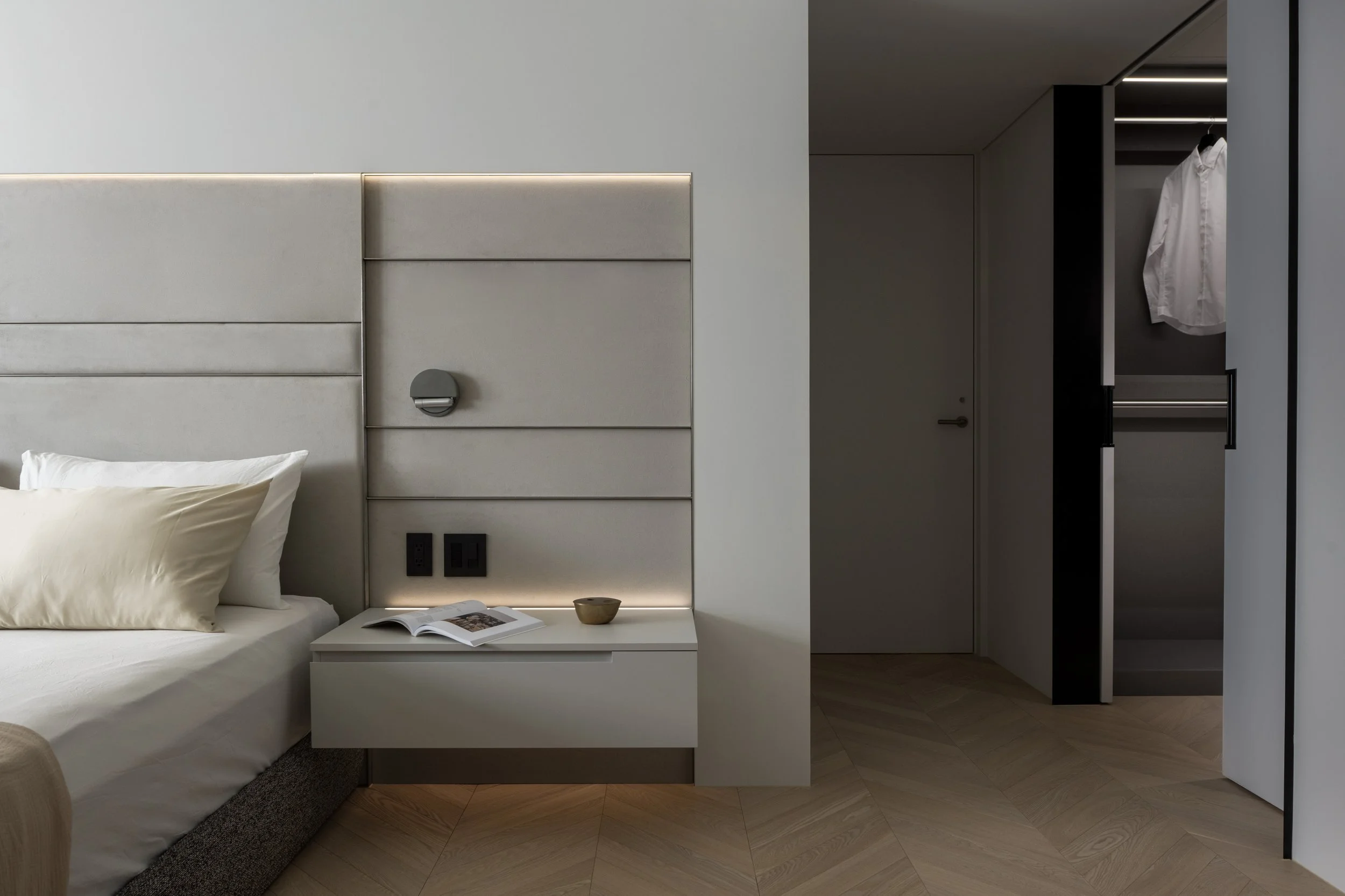 室內地坪使用人字拼的實木地板,醞釀空間中靜謐而緩慢的氛圍,透過光線的分隔創造出不同的區域空間。天花設計了許多隱藏光源暈染出舒適的空間氛圍,確保生活不同時刻的清晰度和邏輯性。