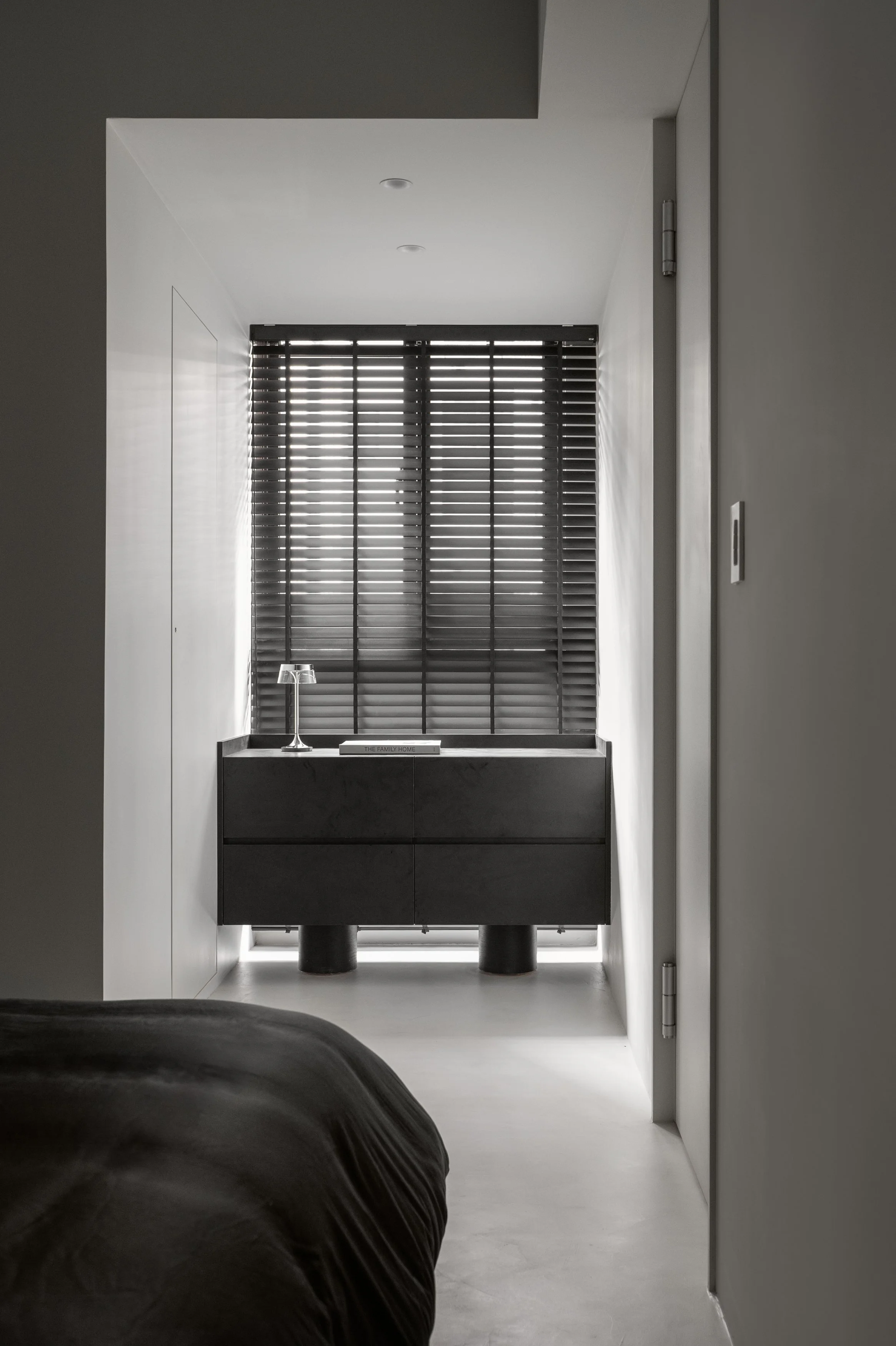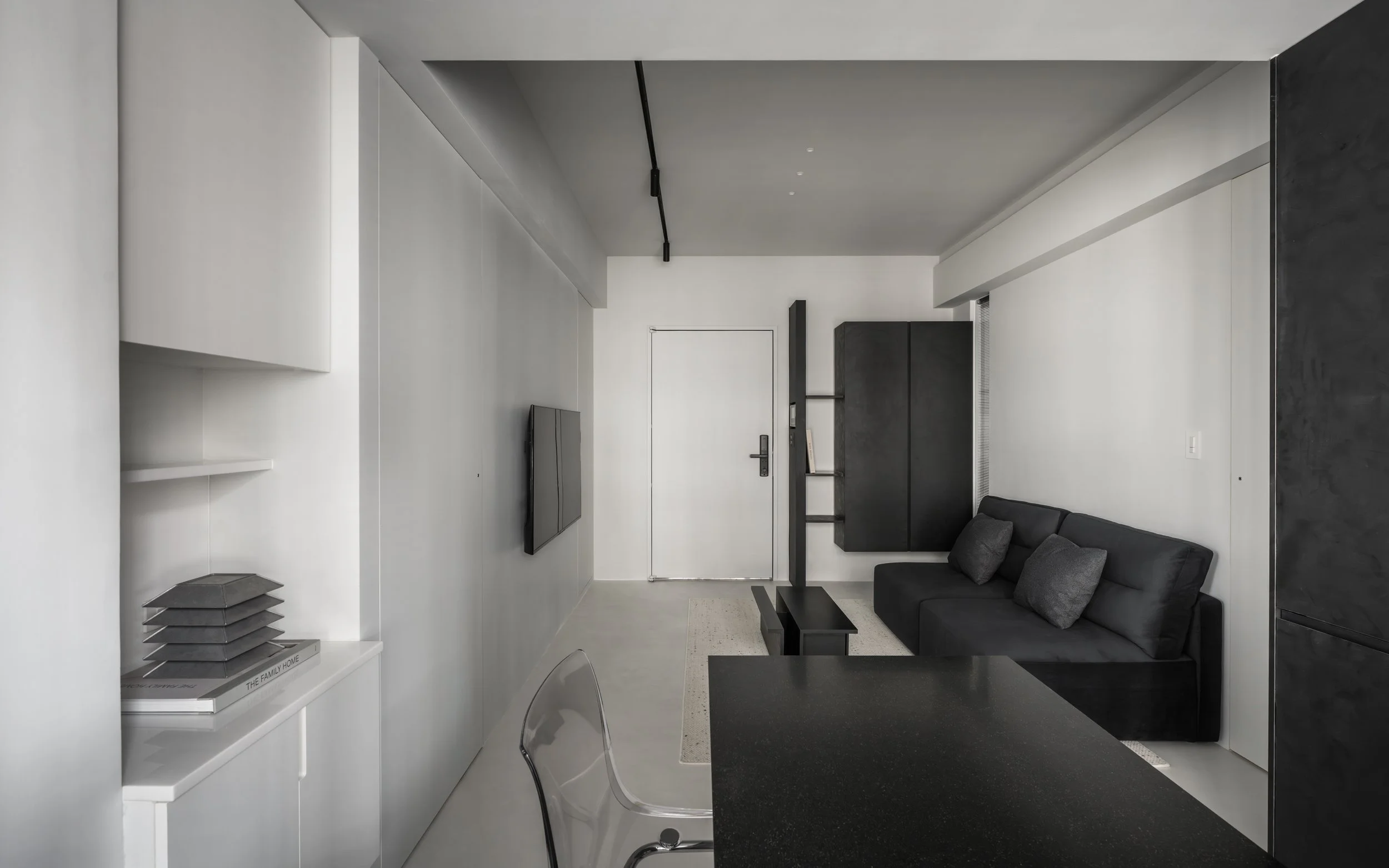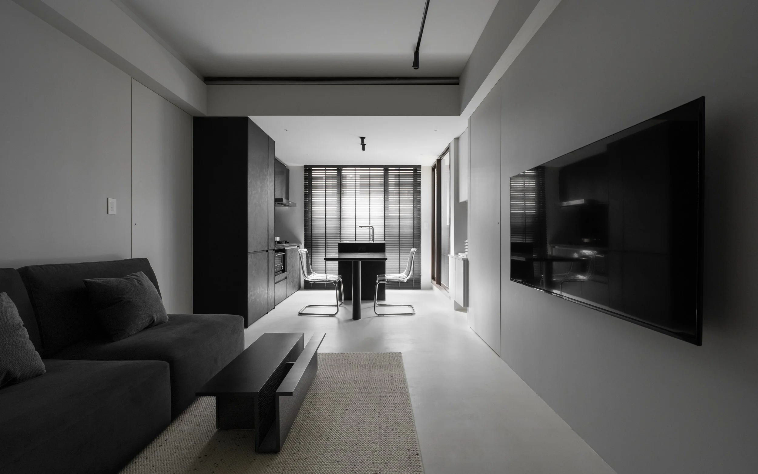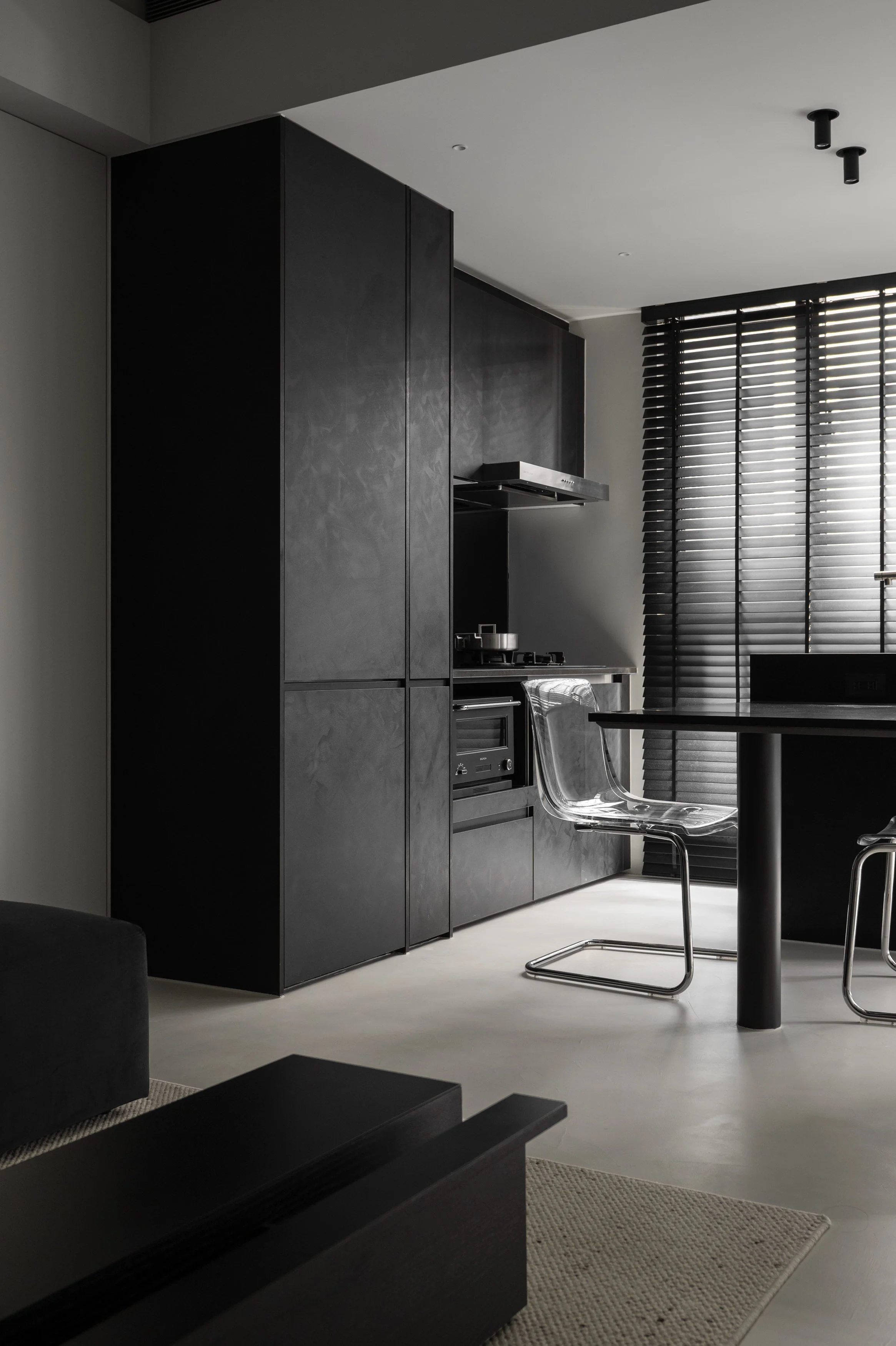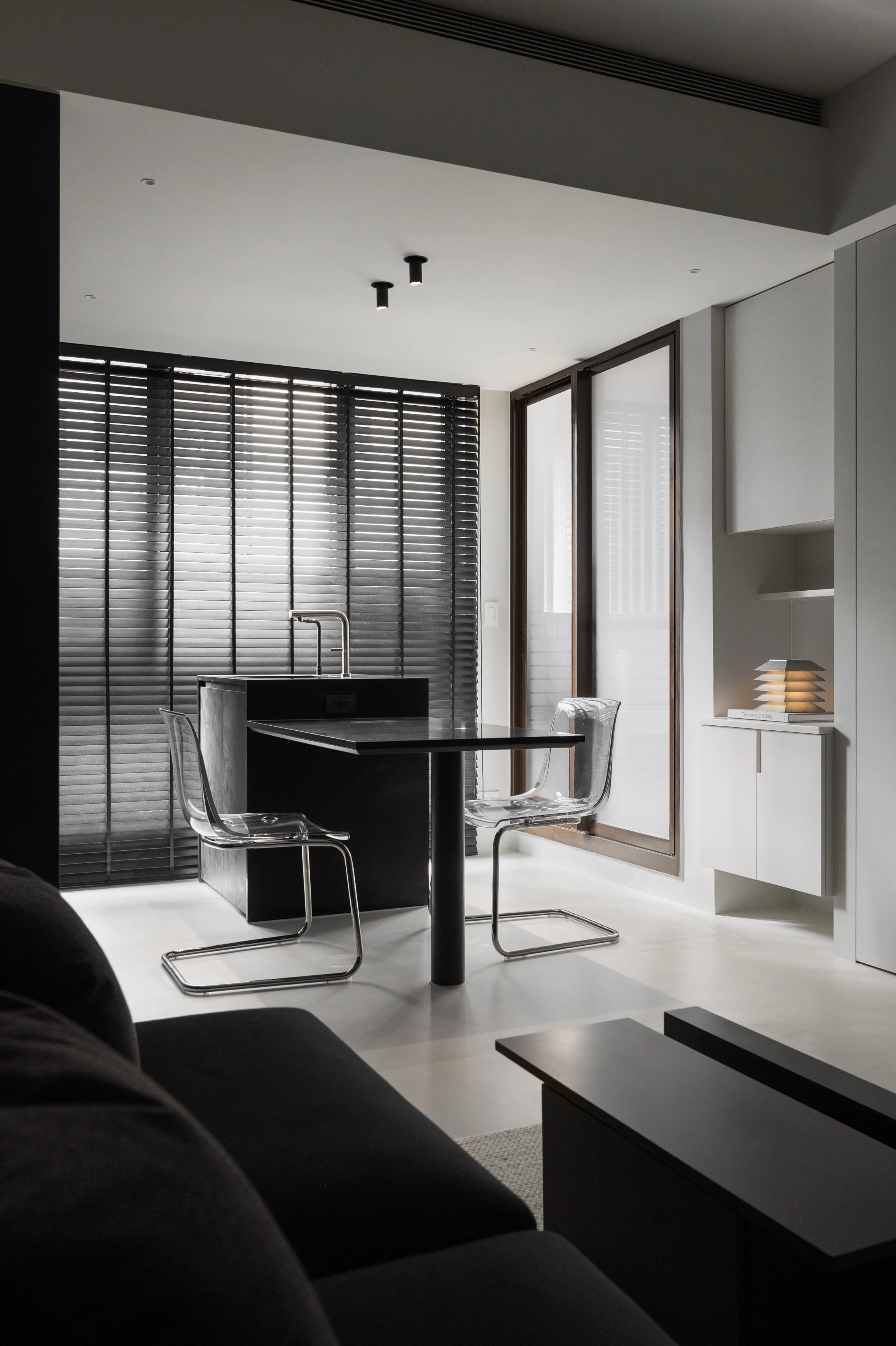 在有限的空間尺度中,設計策略聚焦於比例整合,機能被隱入牆面與櫃體,動線延續著立面邏輯蔓延,並在材料上的選擇更單一,將材料畫面感呈現出最大的視覺效果。