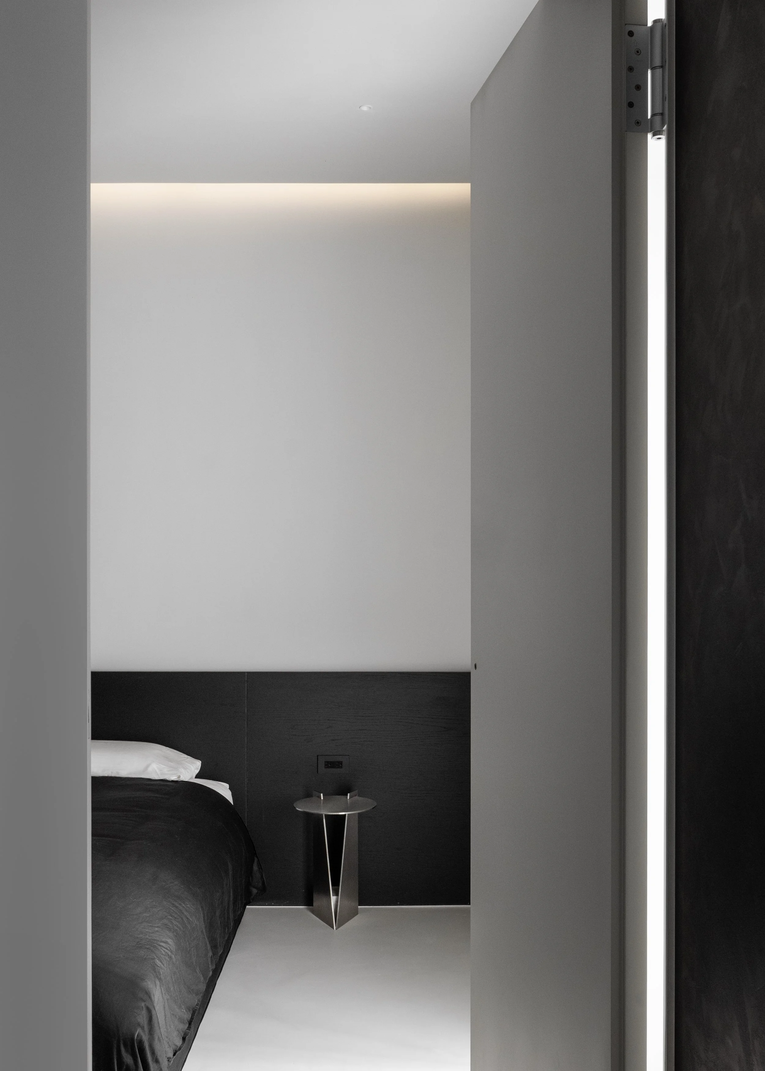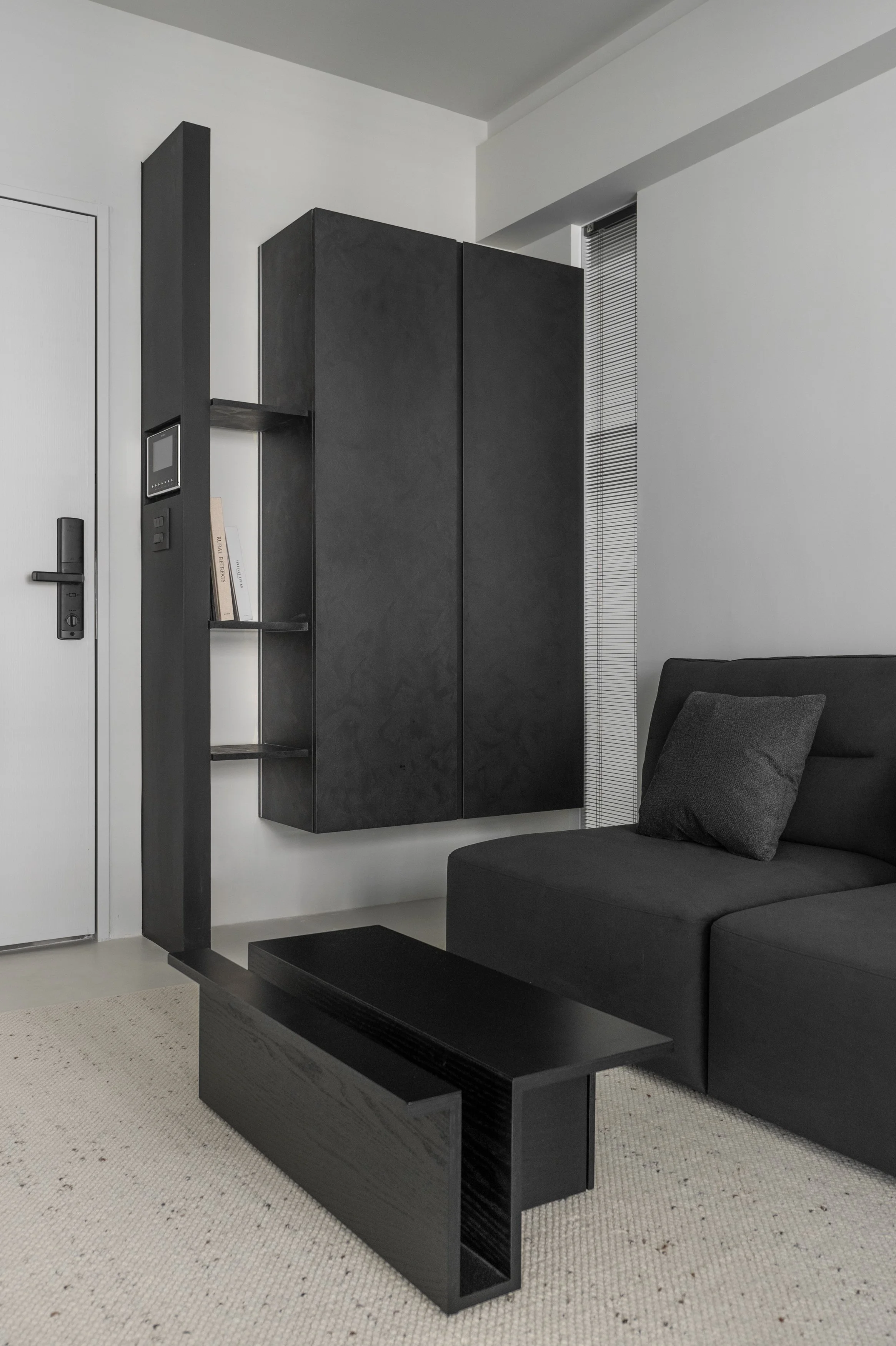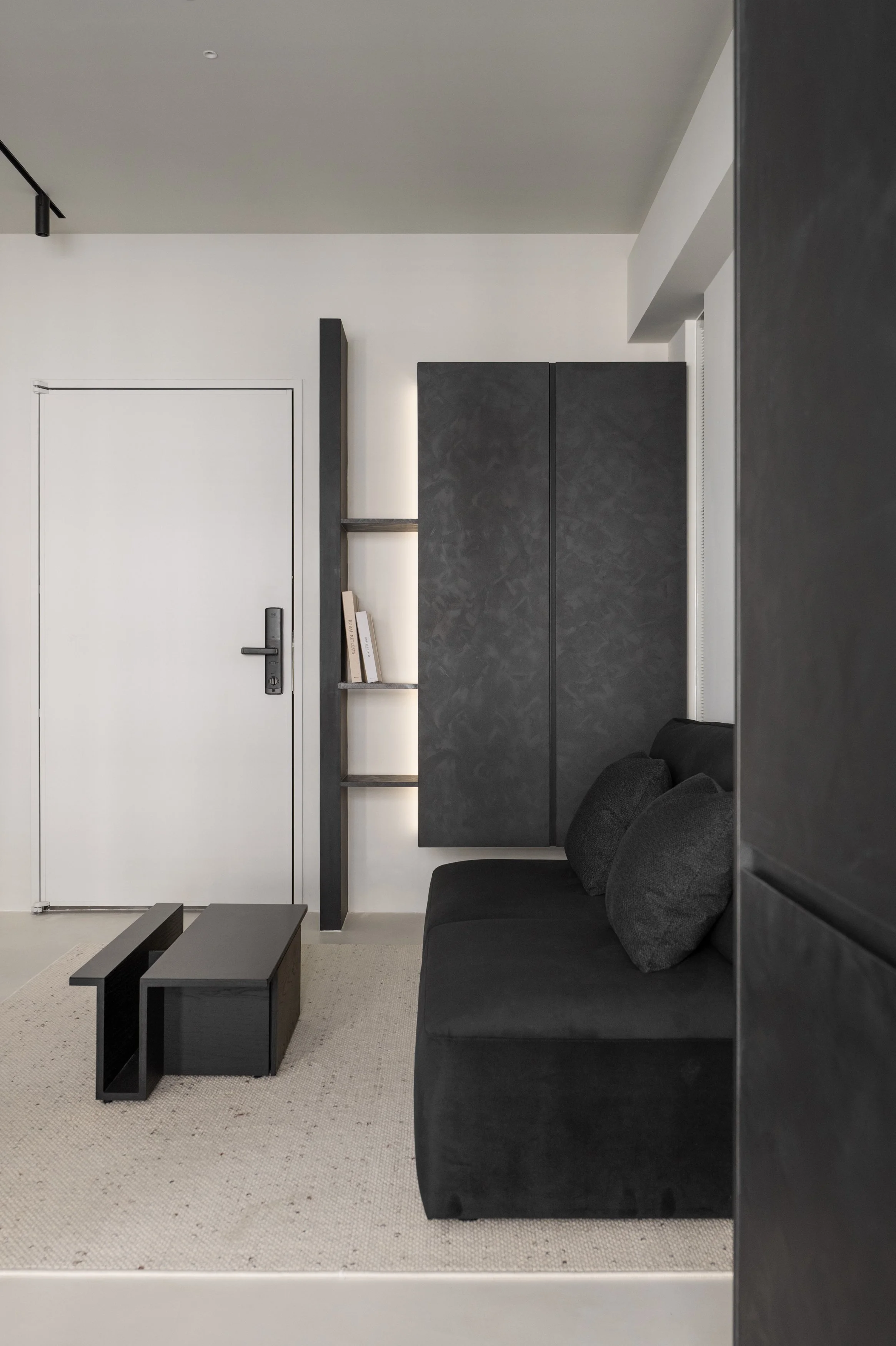 在僅有黑、白之空間,比例與光成為最關鍵的構成要素,極限的色域中,黑與白被轉化為控制與秩序的語言,不同材質的黑在光線中層層堆疊、彼此呼應,形塑出具有延伸性的立面張力。