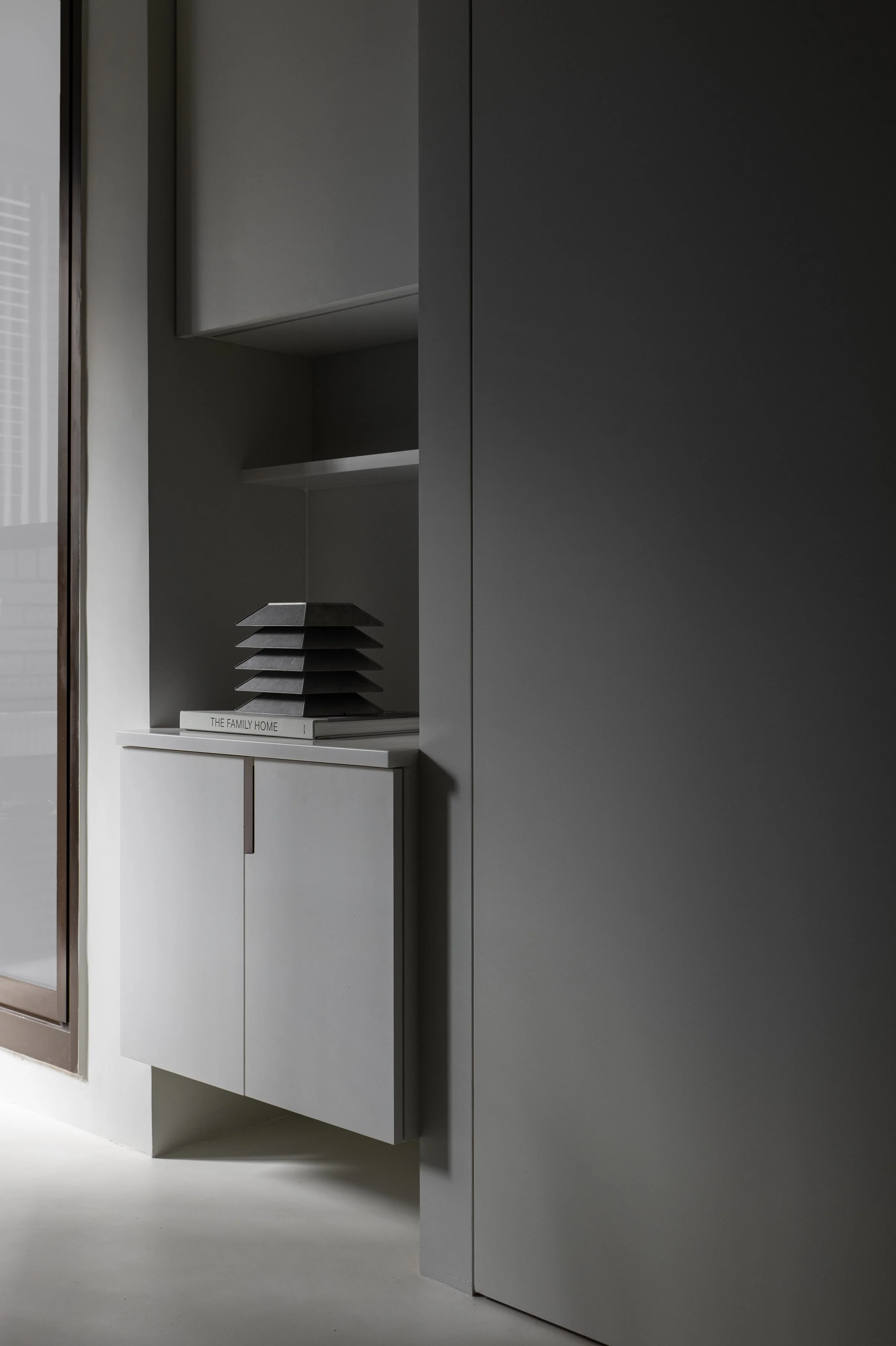 Within a compact spatial scale, the design strategy centers on proportional integration. Functions are concealed within walls and cabinetry, while circulation extends along the logic of the facade. The material palette is deliberately reduced, allowing visual continuity to reach its full expressive potential.