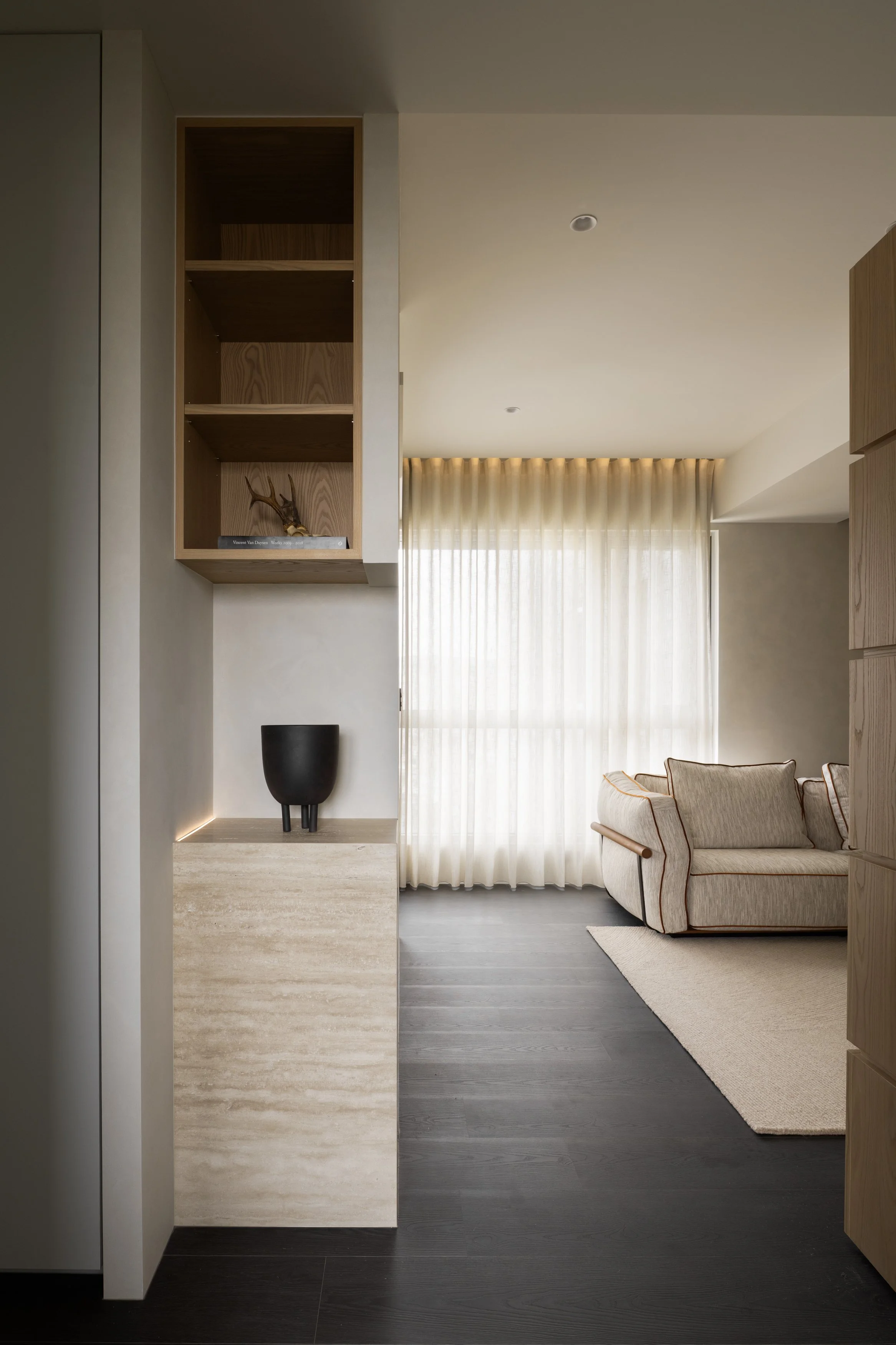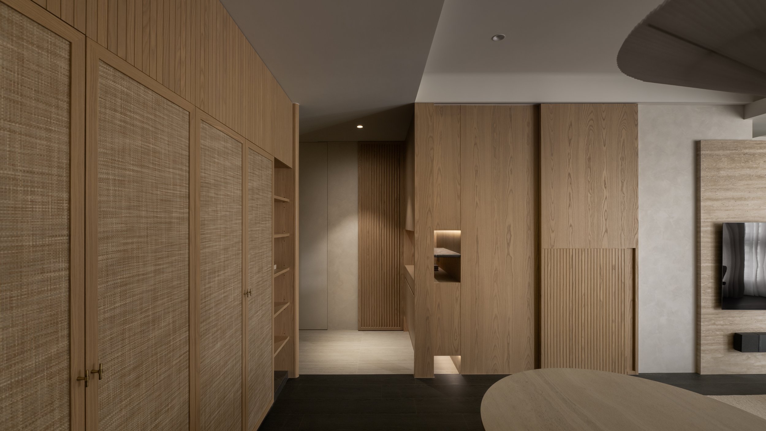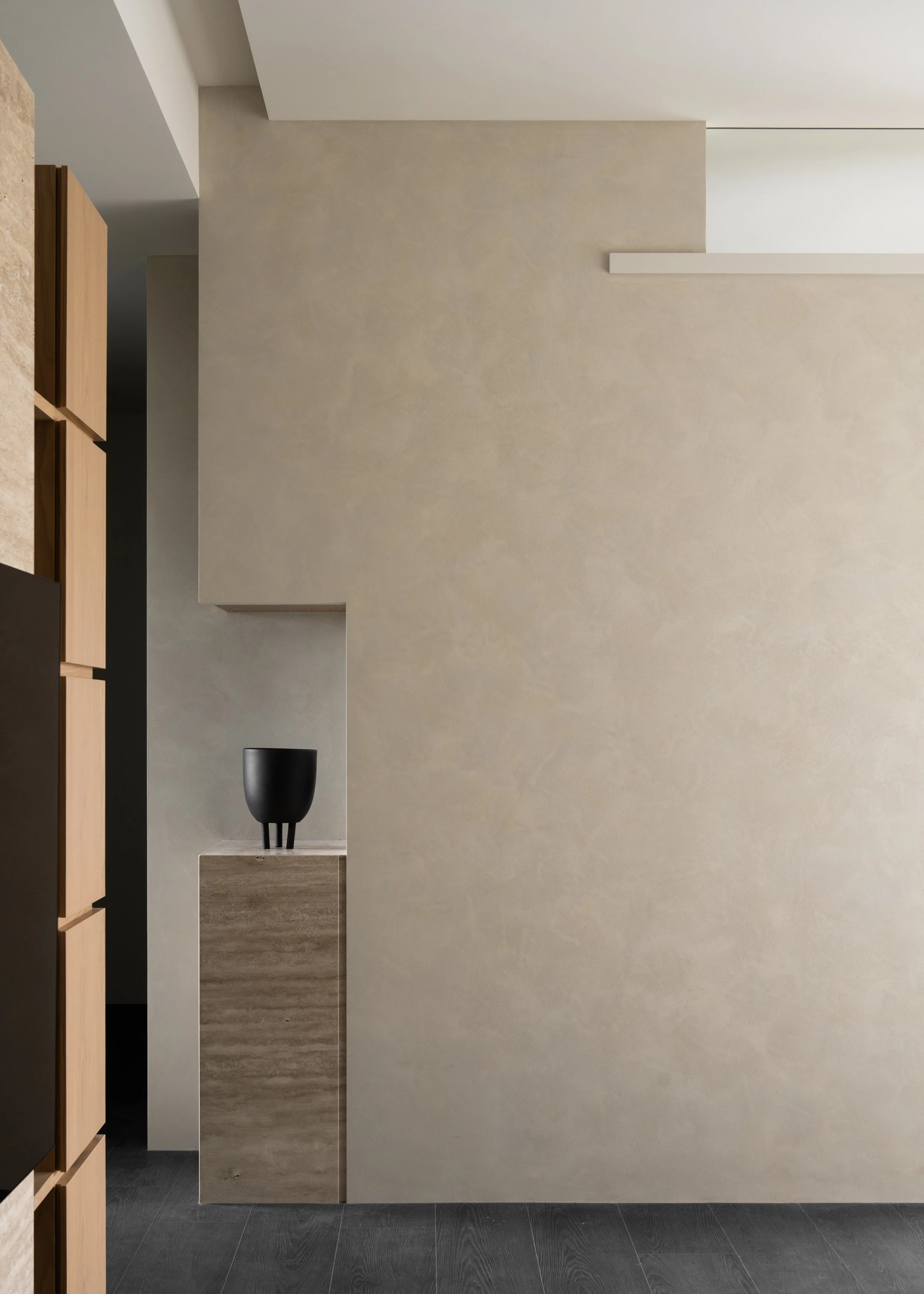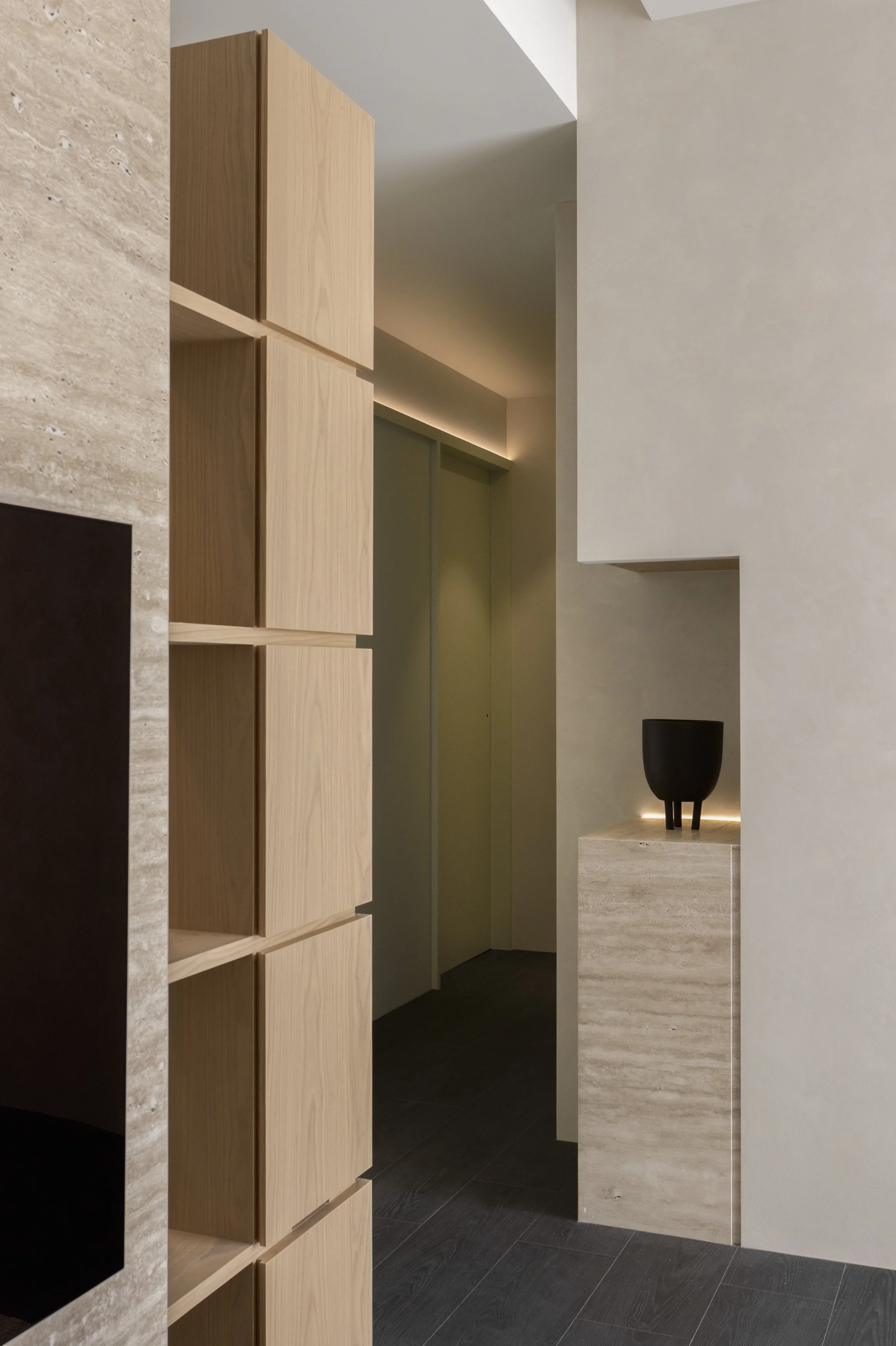 透過界面的轉折與材料的收斂,光得以被引導並緩慢滯留,在牆體與量體之間,形塑出可被感知的層次與深度。木皮選擇帶有明顯木節的紋理,保留其生長痕跡與非均質特徵,使表面呈現不規則且可辨識的時間性;洞石則藉由其孔隙與層理結構,提供介於粗獷與細緻之間的觸覺層次;礦物性特殊漆作為背景界面,以低反射的表面特性維持整體的連續性,並適度弱化視覺干擾。