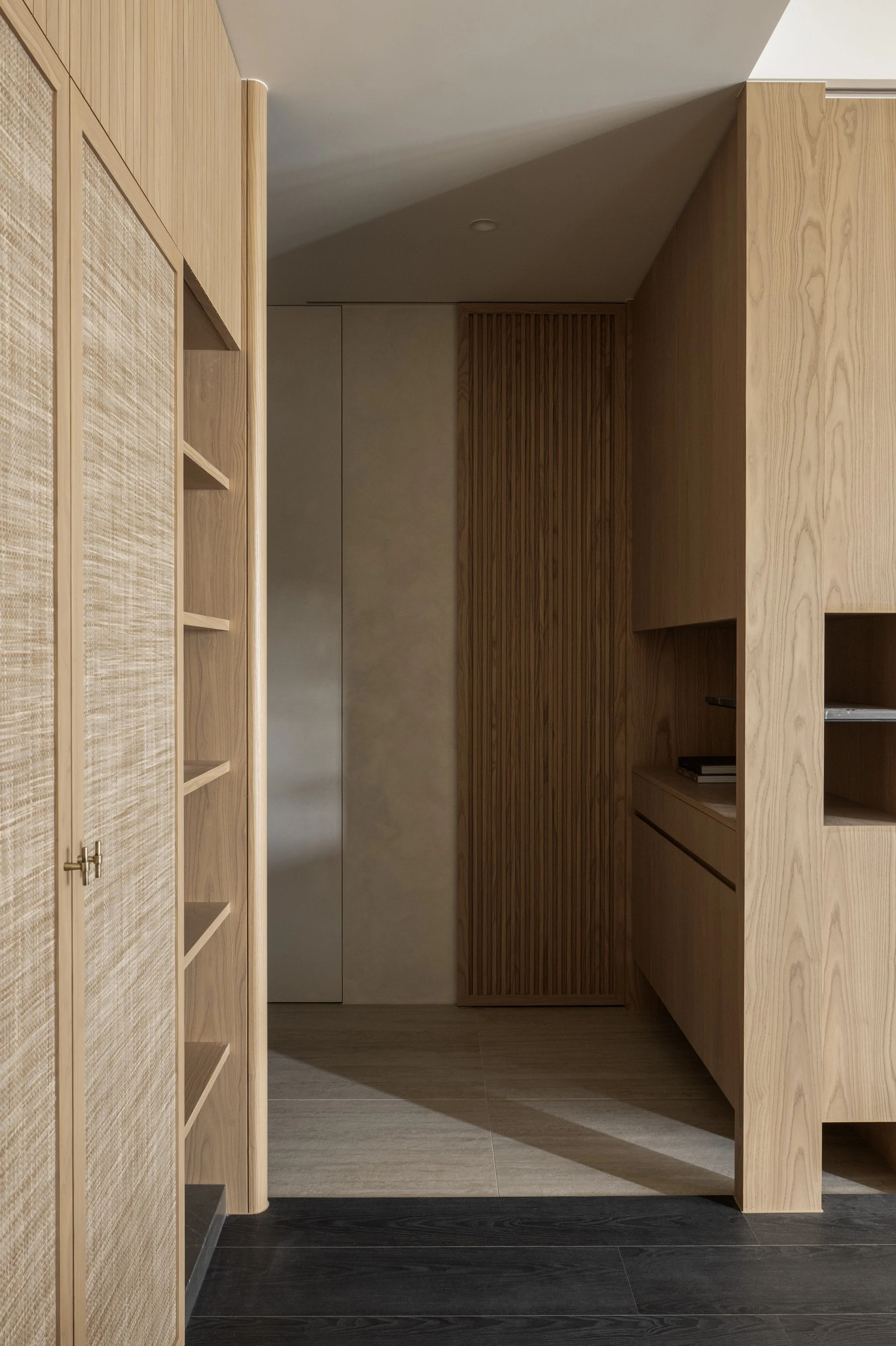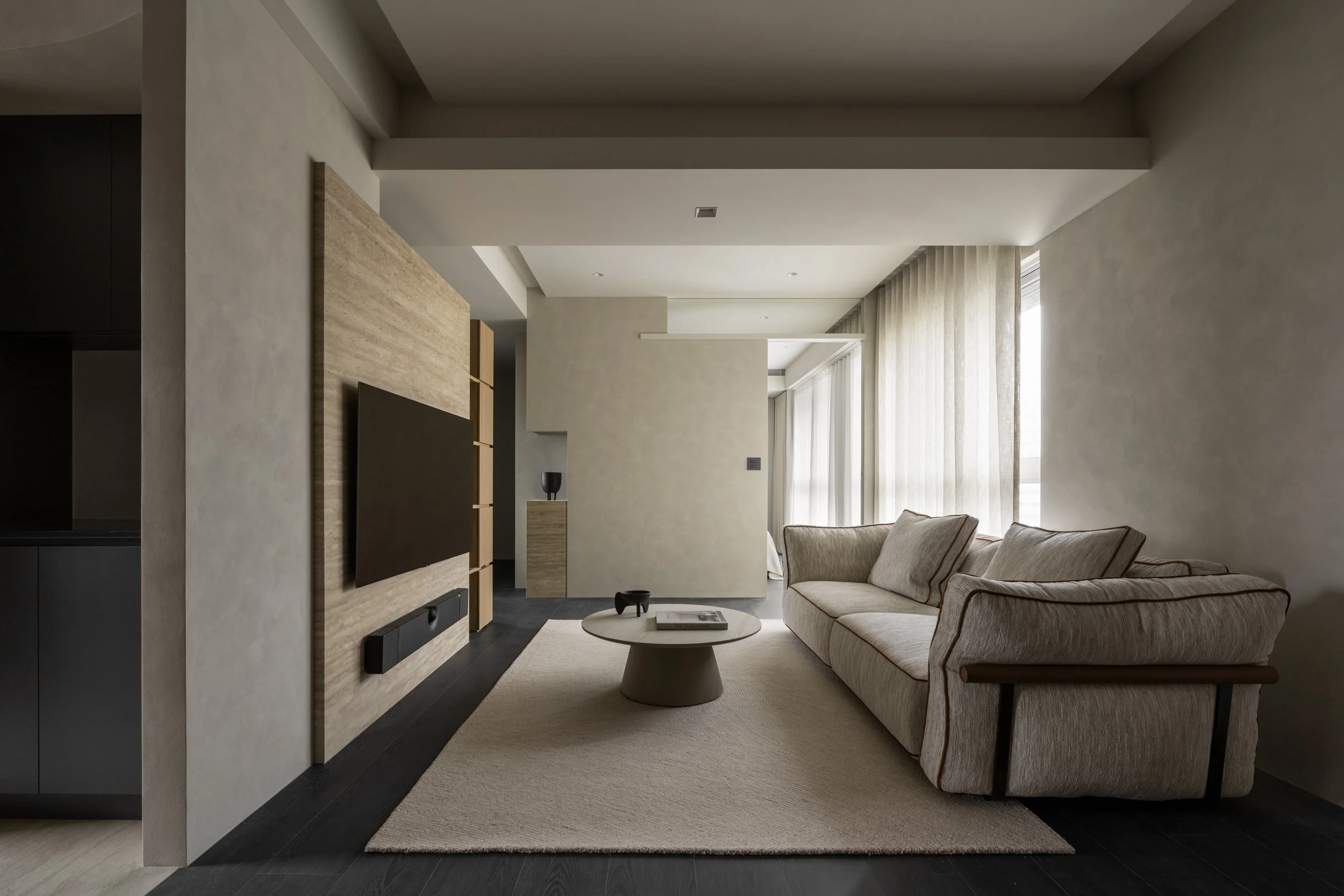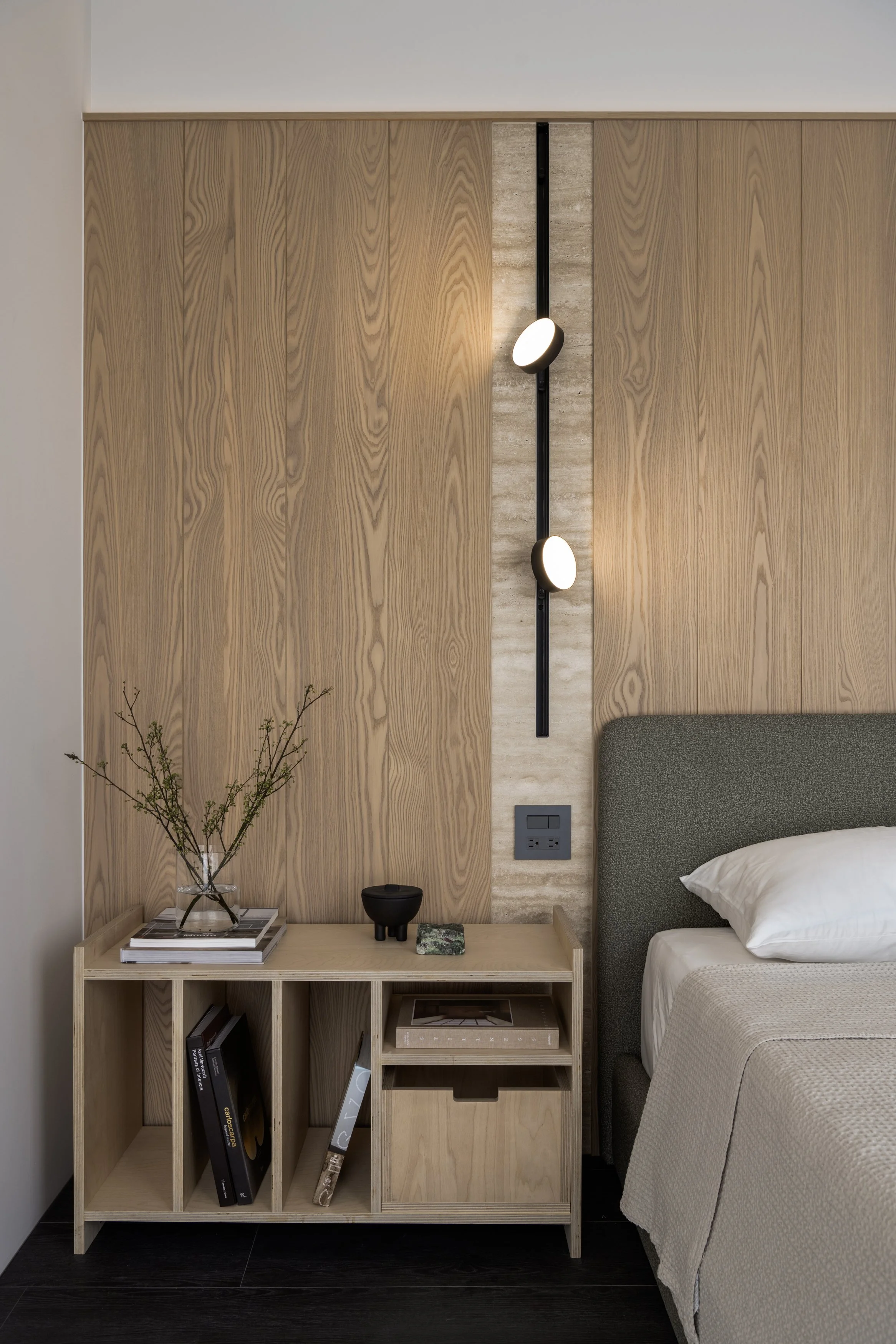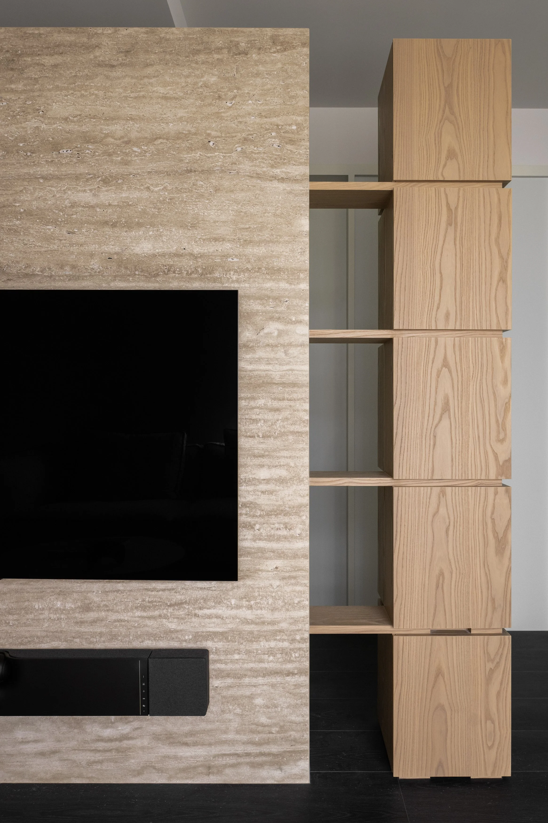 透過界面的轉折與材料的收斂,光得以被引導並緩慢滯留,在牆體與量體之間,形塑出可被感知的層次與深度。木皮選擇帶有明顯木節的紋理,保留其生長痕跡與非均質特徵,使表面呈現不規則且可辨識的時間性;洞石則藉由其孔隙與層理結構,提供介於粗獷與細緻之間的觸覺層次;礦物性特殊漆作為背景界面,以低反射的表面特性維持整體的連續性,並適度弱化視覺干擾。