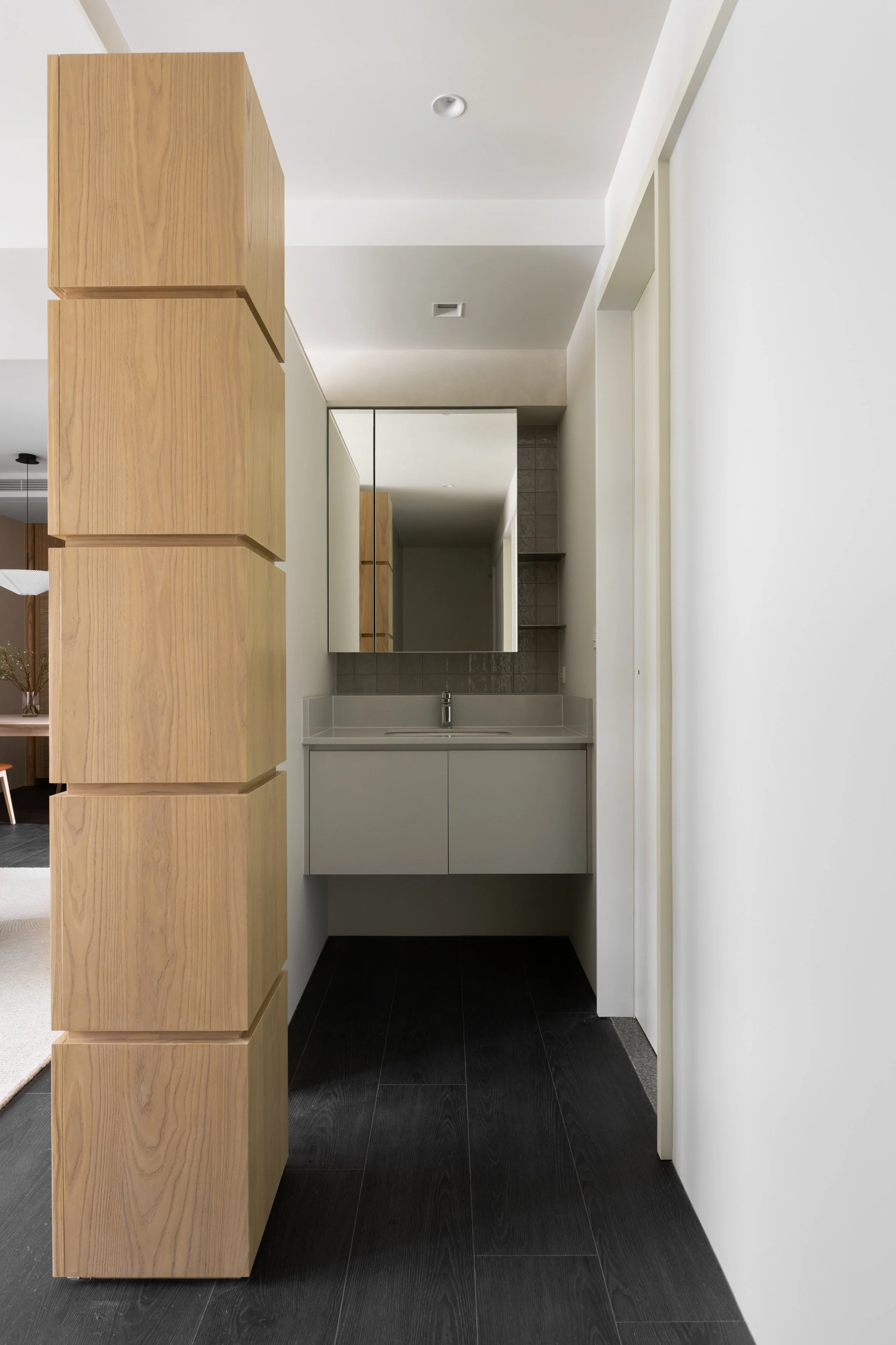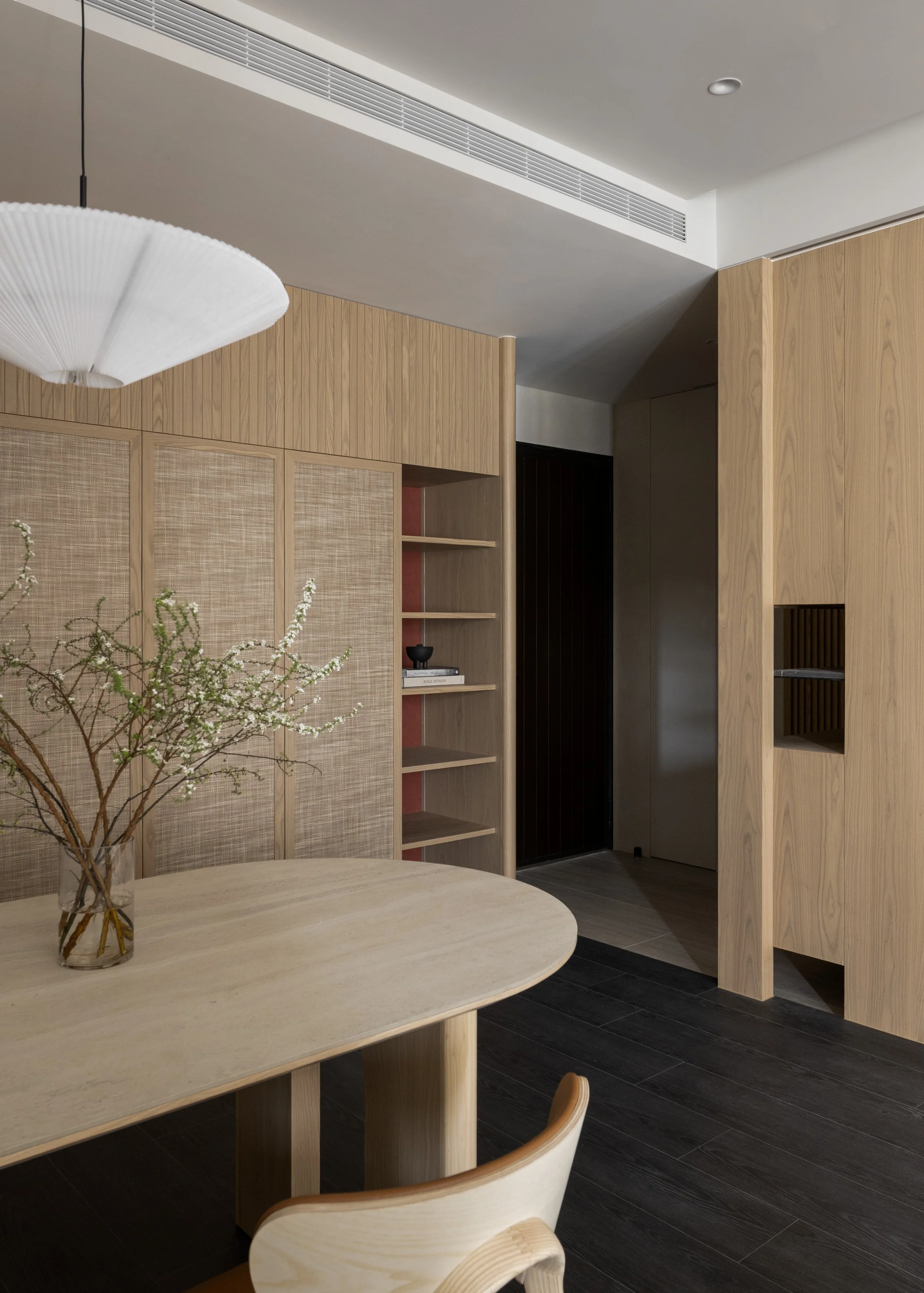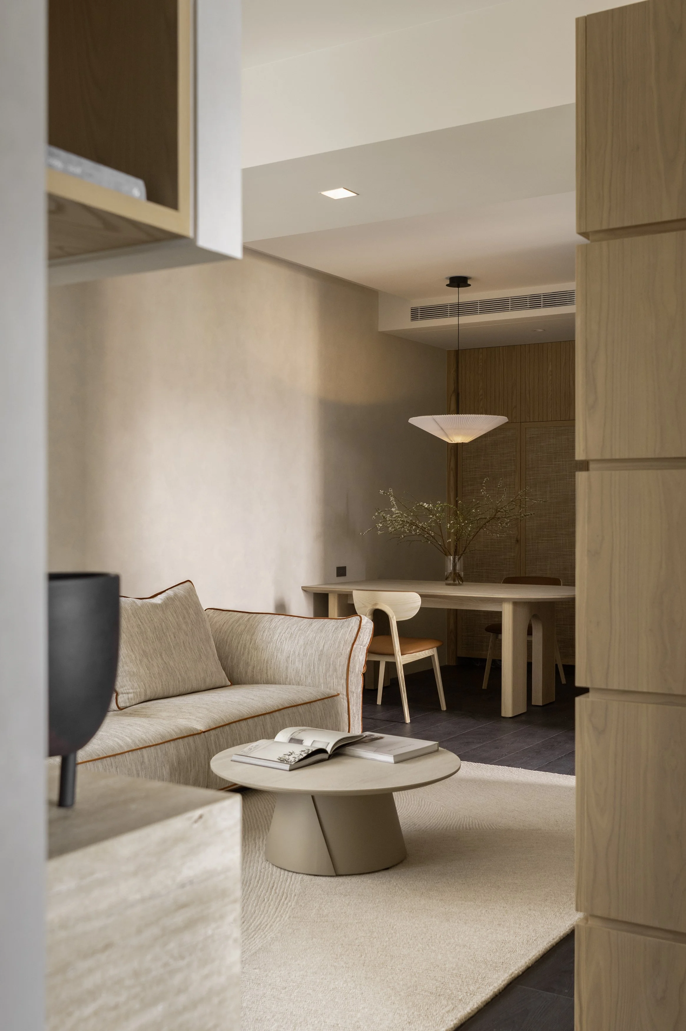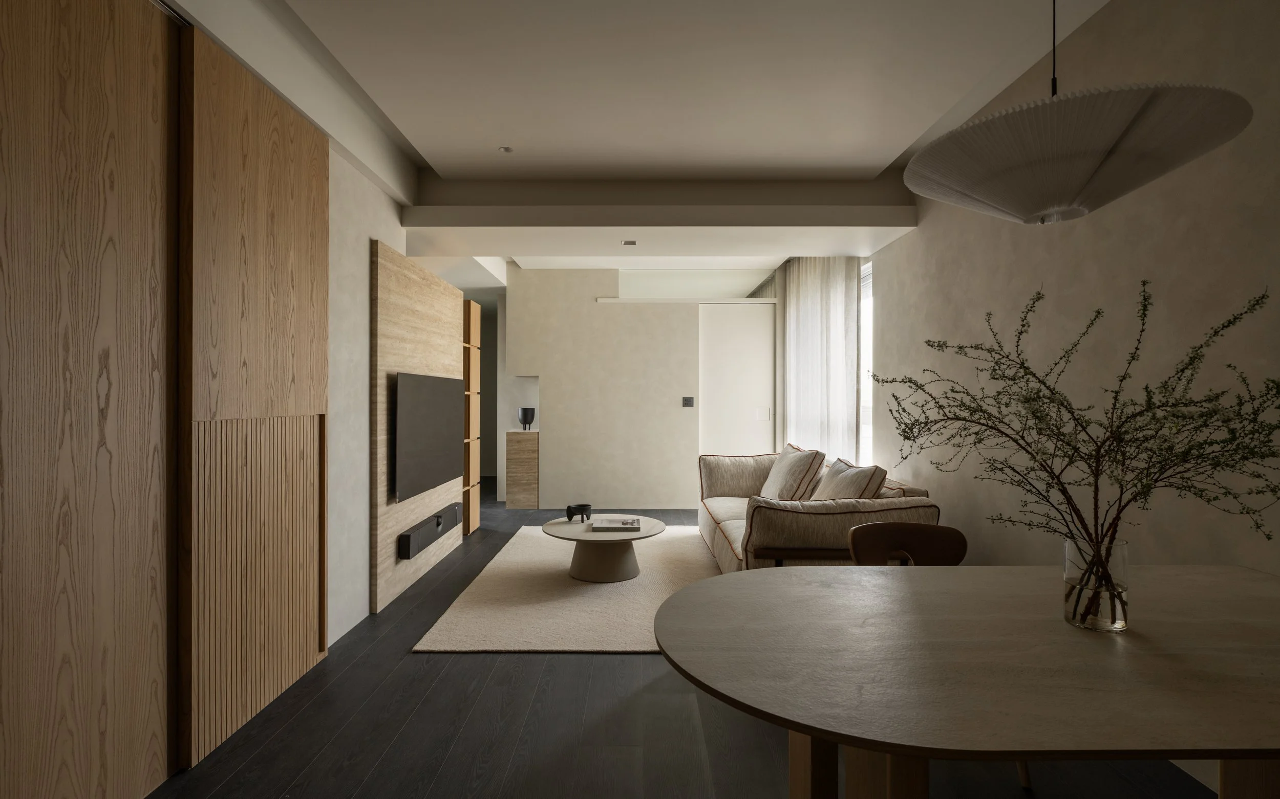 透過界面的轉折與材料的收斂,光得以被引導並緩慢滯留,在牆體與量體之間,形塑出可被感知的層次與深度。木皮選擇帶有明顯木節的紋理,保留其生長痕跡與非均質特徵,使表面呈現不規則且可辨識的時間性;洞石則藉由其孔隙與層理結構,提供介於粗獷與細緻之間的觸覺層次;礦物性特殊漆作為背景界面,以低反射的表面特性維持整體的連續性,並適度弱化視覺干擾。
