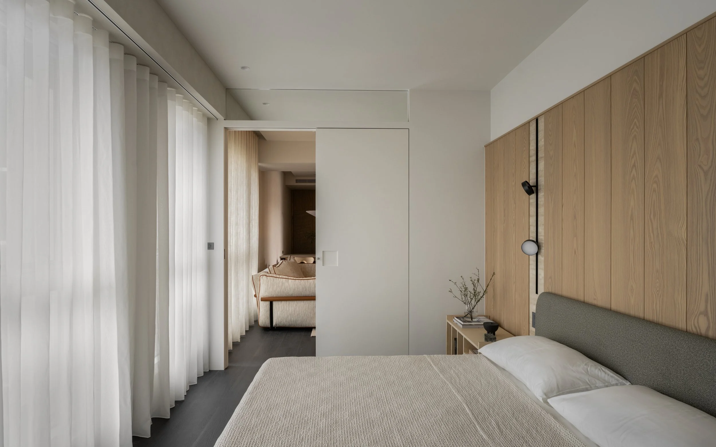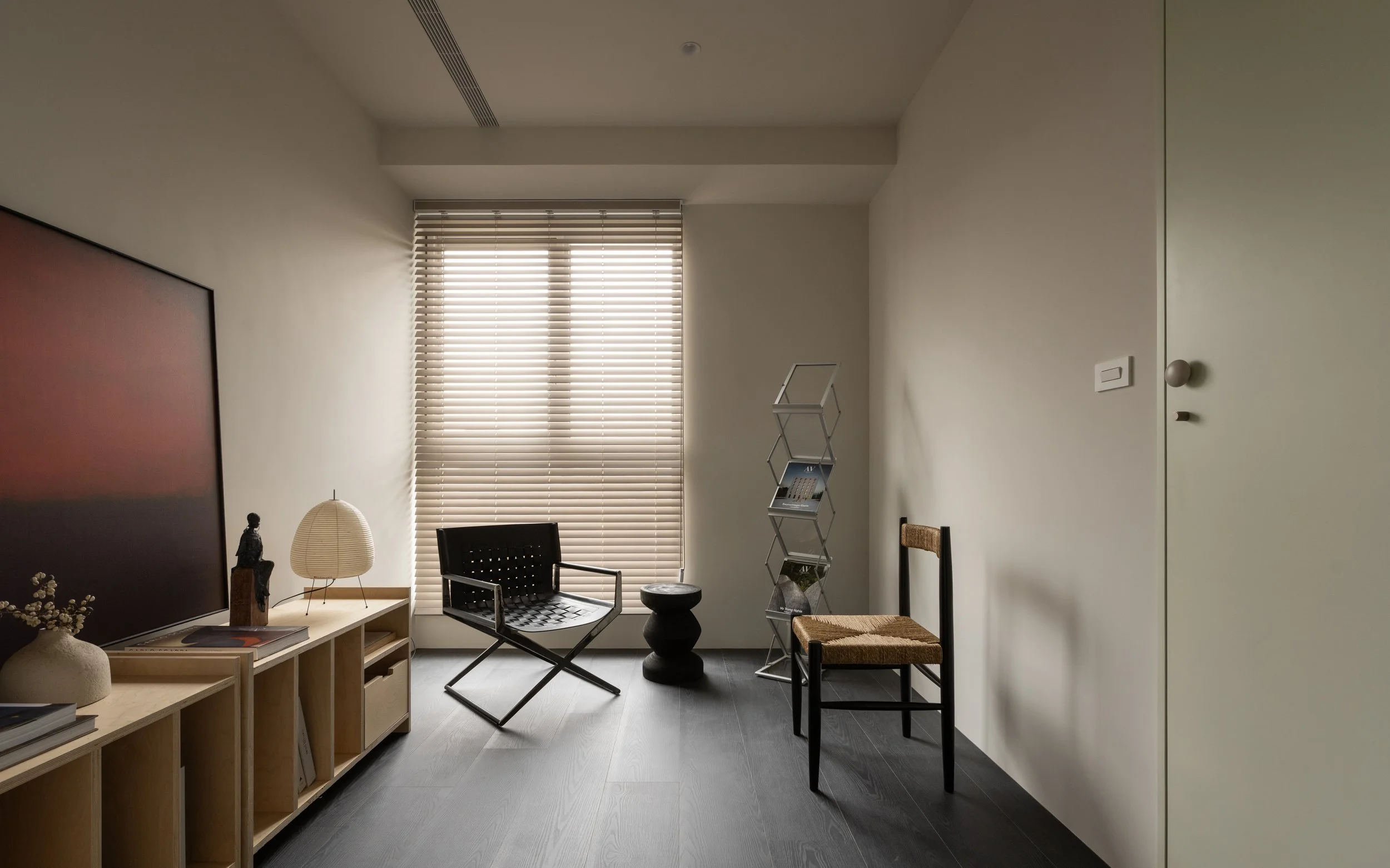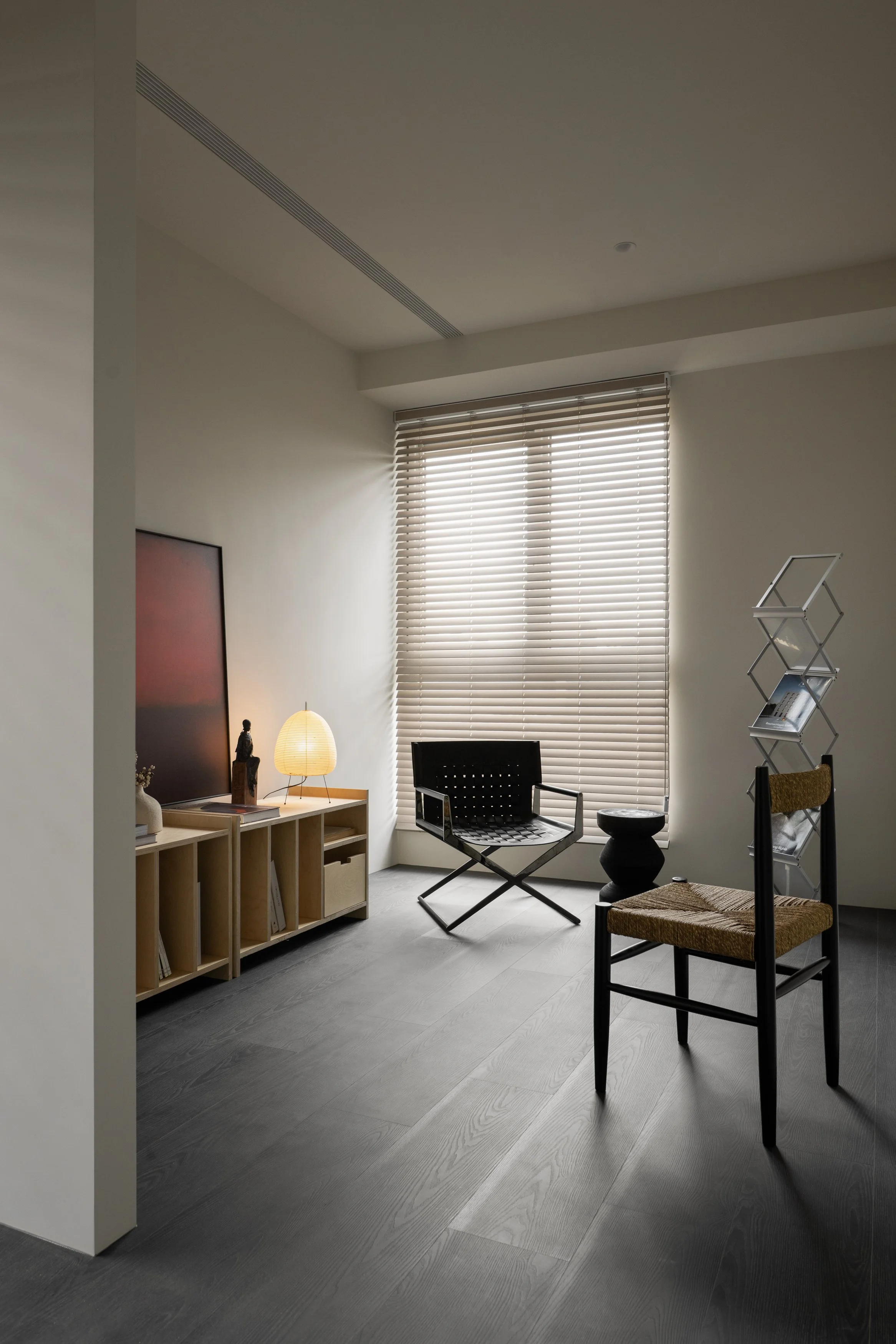地坪選用較深的木質鋪面,作為空間的基準面,穩定整體重量感;並與牆面及天花形成清晰的垂直層級,使空間在單一語彙之中,仍保有尺度上的差異與方向性。Light is not conceived as a supplementary element, but as a spatial condition to be received and inhabited.